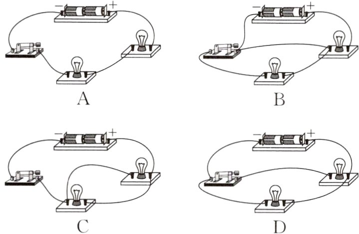 B [点拨]图A中各元件依次连接,只有一条电流路径,是串联电路,没有短路现象,故A不符合题意;图B中,中间的导线与左边的灯泡、开关并联,左边灯泡被短路,故B符合题意;图C中电流从正极出发,分成两支,分别流向两个灯泡,然后经开关共同回到负极,即两灯并联,没有短路现象,故C不符合题意;图D中电流分两支,分别流入右边灯泡和开关、左边的灯泡,然后共同回到负极,即两灯并联,没有短路现象,故D不符合题意。