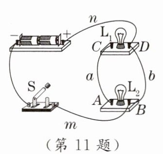 CD [点拨]由图可知,开关闭合后,电源的两极通过导线n、b、m以及开关直接连接起来了,电源发生了短路,两个灯泡不能发光,而且会烧坏电源,去掉导线a对此无影响,故A、B错误,C正确;将导线m从B接线柱移至A,此时电流有两条路径,分别经过两个灯泡,L₁和L₂并联,故D正确。