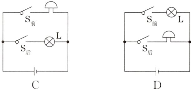 8.[2023.扬州]物流仓库值班室,当前门来入时灯亮,后门来入时电铃响。下列电路设计符合要求的是 ( )