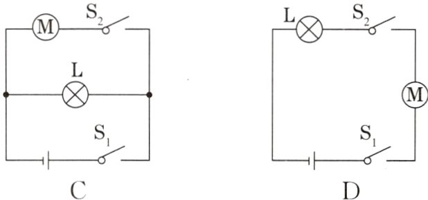 9.[2023.遂宁]张明同学发现,未戴头盔骑行“共享助力车”存在安全隐患。于是他设计以下改进方案:在头盔内加装遥控设备,控制助力车工作电路中开关S₂的通断。骑行前,扫码成功后开关S₁闭合,指示灯L亮,但电动机不工作;从车头取出头盔并戴上后,头盔内遥控设备遥控开关S₂闭合,电动机才通电工作;若只戴头盔不扫码则无法骑行。下列电路符合以上设计要求的是 ( )
