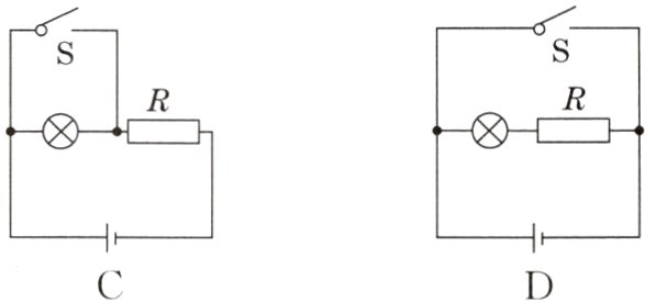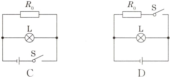 6.[2023.天津期末]某同学设计了道路井盖移动报警电路。当井盖没有被移动,井盖开关S闭合,警示灯L不亮;当井盖被移动,井盖开关S断开,警示灯L发光,R₀为保护电阻。下图中符合设计要求的电路图是 ( )