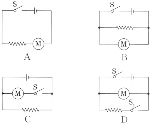 D [点拨]图A闭合开关,电阻丝和电动机串联,同时工作,只能吹热风,故A错误;图B闭合干路开关,电阻丝和电动机并联,同时工作,只能吹热风,故B错误;图C开关断开时,只有电阻丝连入电路,只发热不吹风,会因温度过高引发安全事故,故C错误;图D只闭合开关S₁,电路为电动机的简单电路,吹冷风,再闭合S₂,电阻丝和电动机并联,同时工作,吹热风,设计合理,故D正确。