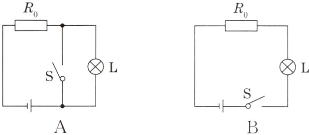 A [点拨]由图A知,闭合开关,警示灯L短路不能发光,断开开关,警示灯L和保护电阻R₀串联,警示灯L能够发光,故A符合题意;图B警示灯L与保护电阻R₀串联,闭合开关,警示灯L发光,断开开关,警示灯L不发光,故B不符合题意;图C警示灯L与保护电阻R₀并联,闭合开关,警示灯L发光,断开开关,警示灯L不发光,故C不符合题意;图D警示灯L与保护电阻R₀并联,开关控制保护电阻R₀,无论开关是否闭合,警示灯L都能发光,故D不符合题意。