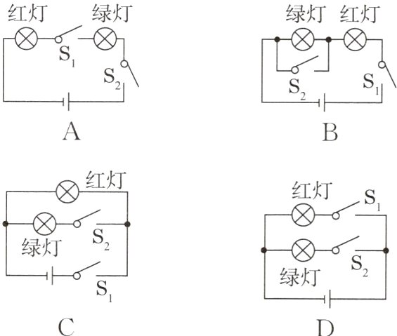 13.[2023.广元]同学们在进行研学活动时,观察到某交通路口指挥车辆通行的信号灯由红灯和绿灯组成,绿灯行,红灯停,以下是他们画出的红绿灯工作时的电路简图,你认为其中正确的是 ( )