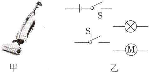 9.[2023.汕头模拟]图甲是一款可充电无线电动拖地机,闭合开关S后,拖地机主体前端的电动机即可带动抹布擦地;旁边的灯可在打扫较暗处时辅助照明,该灯只有在拖地机擦地过程中才能使用,不能单独工作。请根据以上信息,将图乙中的电路图补充完整。