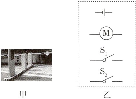 10.[2023.江门二模]现代的住宅小区,大门口都有车辆感应自动开闸系统。如图甲,当已经被录入车牌号码的小车来到小区门口时,感应开关S₁闭合,道闸杆会自动升起,小车顺利进出,之后,感应开关S₁断开,道闸杆会自动降落;而当未被录入车牌号码的小车来到小区门口时,道闸杆不会升起,经过保安人员检查同意后,保安人员闭合手动开关S₂,道闸杆才能升起,小车才能进出,之后手动开关S₂断开,道闸杆降落。请你用笔画线代替导线在方框乙内连接符合上述要求的电路图(其中M是控制道闸杆的电动机)。
