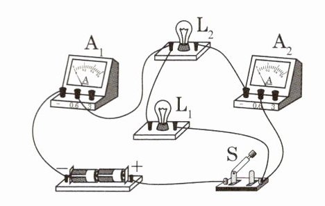 0.2;0.3 [点拨]由题图可知,闭合开关后,两灯泡并联,电流表A₁测干路的电流,电流表A₂测通过小灯泡L₂的电流,所以通过小灯泡L₂的电流I₂ = 0.3A,由并联电路的电流规律可知,通过小灯泡L₁的电流I₁ = I - I₂ = 0.5A - 0.3A = 0.2A。
