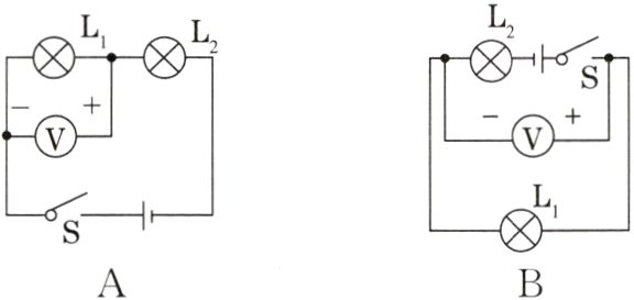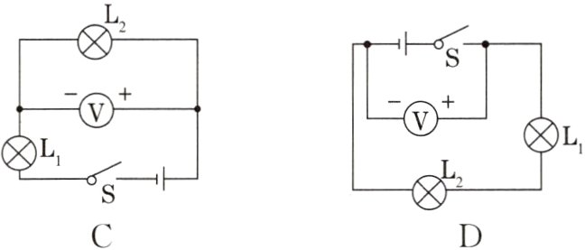 B [点拨]A中电压表与小灯泡L₁并联,测量的是小灯泡L₁两端的电压,但电压表的正、负接线柱接反了,故A不符合题意;B中电压表与小灯泡L₂并联,测量的是小灯泡L₂两端的电压,“+”“ - ”接线柱接法也正确,故B符合题意;C中电压表与灯泡L₁并联,测量的是灯泡L₁两端的电压,故C不符合题意;D中电压表与电源并联,测量的是电源两端的电压,也是小灯泡L₁和L₂串联后的总电压,故D不符合题意。