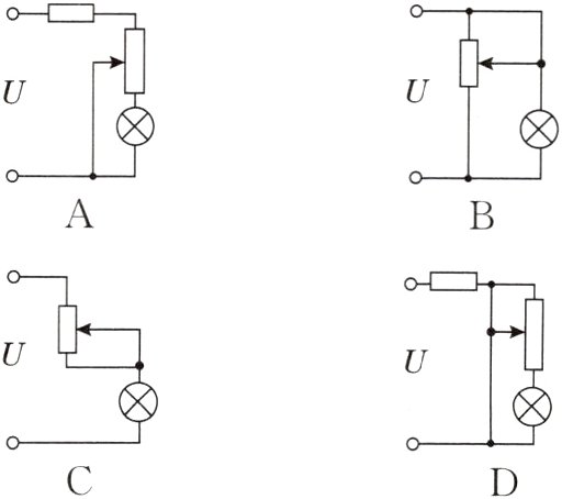 C [点拨]A中灯泡和滑动变阻器的下半段短路,灯泡不亮,滑动变阻器不能调节灯泡的亮度,A不符合题意。B中滑动变阻器的上半段短路,灯泡和滑动变阻器的下半段是并联的,灯泡两端电压始终等于电源电压,所以滑动变阻器不能改变灯泡的亮度,B不符合题意。C中滑动变阻器和灯泡是串联的,移动滑动变阻器的滑片,改变电路中的电阻,改变电路中的电流,改变灯泡的亮度,C符合题意。D中灯泡和滑动变阻器都短路,灯泡不能发光,滑动变阻器不能调节灯泡的亮度,D不符合题意。