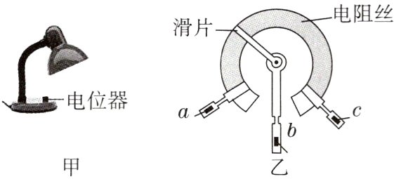 10.[2023.成都锦江区校级开学]如图甲所示为某可调节亮度的台灯,图乙为其用于调光的电位器结构图,a、b、c是它的三个接线柱,a、c 分别与弧形电阻丝的两端相连,b与金属滑片相连,转动旋钮,滑片在弧形电阻丝上滑动即可调节灯泡亮度。下列分析正确的是 ( )