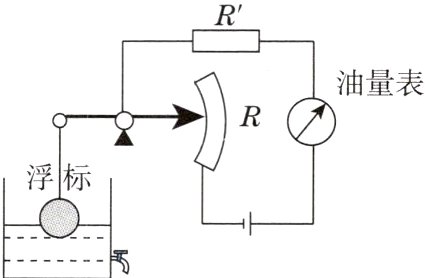 电流表;变大;变小 [点拨]该油量表是串联在电路中的,所以它是由电流表改装而成的。当油量减少时,浮标下降,使得指针上移,R连入电路的电阻变大,电路中的电流变小,油量表的示数变小。