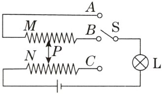 A [点拨]S和A接触,M和N的左边部分接入电路,P向右移动时,接入电路的电阻丝变长,电阻增大,电流减小,灯泡变暗,A正确;S和B接触,M的右边部分和N的左边部分接入电路,P向右移动时,接入电路的电阻丝长度不变,电阻不变,电流不变,灯泡亮度不变,B错误;S和C接触,N全部接入电路,P向右或向左移动时,接入电路的电阻丝长度不变,电阻不变,电流不变,灯泡亮度不变,C、D错误。