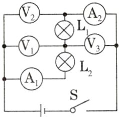 B [点拨]由电路图可知,电流从电源的正极出发,依次经电流表A1、L1、L2、电流表A2回到电源的负极,即电流只有一条路径,两灯串联,且两电流表均测电路中的电流。由电压表与被测电路元件并联可知,电压表V1测L1两端的电压,电压表V2测电源的电压,电压表V3测L2两端的电压。因串联电路中各处的电流相等,所以两电流表的示数相等,即I1=I2;因串联电路中总电压等于各分电压之和,所以三电压表的示数关系为U2=U1+U3,故B正确。