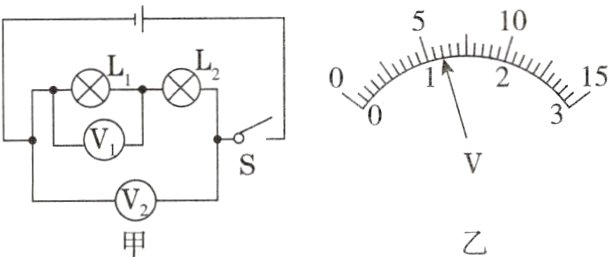 3.[2023.成都期末]如图甲所示的电路中,当闭合开关S时,两灯均发光,电压表V2的示数为5V,V1的指针位置如图乙所示,则灯L1、L2 两端的电压分别为 ( )