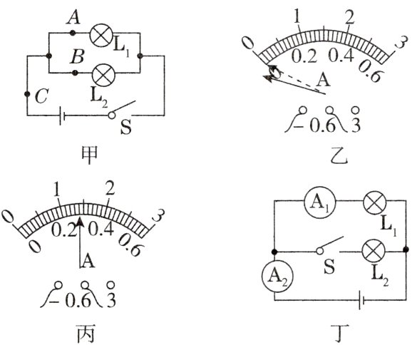 (4)题图丁所示的电路中,开关S断开时,电路中只有灯泡L₁,两电流表示数相等;开关S闭合时,两灯泡并联,电流表A₂测干路电流,A₁测通过灯泡L₁的电流。因并联电路中,各支路互不影响,通过L₁的电流大小即电流表A₁的示数不变。并联电路中,干路中的电流要大于任何一个支路的电流,由于两个表都偏转了22小格,所以电流表A₂选用的是大量程,分度值为0.1A,示数为2.2A,电流表A₁选用的是小量程,分度值为0.02A,示数为0.44A,根据并联电路的电流规律可知,通过L₂的电流I₂ = I - I₁ = 2.2A - 0.44A = 1.76A。