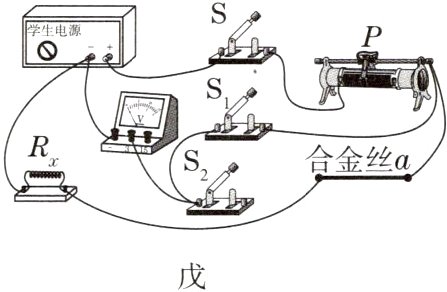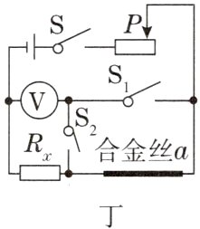 (3)(特殊方法测电阻)小明再利用合金丝a和其他器材测量一个未知电阻$R_x$的阻值,电路如图丁所示。