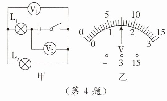 4.[2023.郑州期末改编]如图甲所示电路中,当开关闭合后,两只电压表的指针偏转均如图乙所示,则灯泡L₁两端的电压为____V,灯泡L₂两端的电压为____V,电源电压为____V,灯泡L₁和L₂的阻值之比为________。