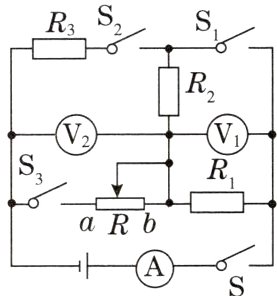 6.[2023.成都模拟改编]在如图所示的电路中,电源电压U保持不变,滑动变阻器R的最大阻值为20Ω。闭合开关S和S2,电压表V1和V2的示数分别为U1和U2,电流表的示数为I1;闭合开关S、S1和S2,电流表的示数为I2;闭合开关S和S3,当滑动变阻器的滑片移到b 端时,电流表的示数为0.2A,电压表V1的示数为4V。已知U1:U2 = 1:3,I1:I2 = 1:4,求: