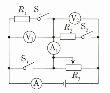 4.[2023.成都二诊,多选]如图所示,电源电压为12V,Rl、R2为定值电阻,R2 = 20Ω,R3为滑动变阻器,其铭牌上标有“?Ω2A"字样。电压表V1所用量程为0~3V,电压表V2所用量程为0~15V,电流表A所用量程为0~3A,电流表A1所用量程为0~0.6A。将滑动变阻器R3的滑片调至最左端,当只闭合开关S3时,电流表A的示数为0.4A;保持滑片位置不变,当只闭合开关Sl时,电压表V的示数为3V。下列结论正确的是 ( )