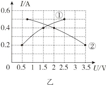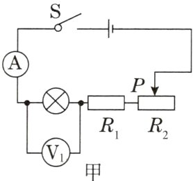 5;1.5 [点拨]由题图甲可知,闭合开关S后,灯泡、R₁、R₂串联,电压表V₁测灯泡两端的电压,电流表测电路中的电流。因灯泡两端的电压越大时通过的电流越大,所以题图乙中图线①是灯泡的I - U图像。由图线②可知,电流表示数随电压表V₂示数的增大而减小,所以电压表V₂测滑动变阻器两端的电压或测定值电阻和滑动变阻器两端的总电压。因串联电路中各处的电流相等,且电路总电压等于各分电压之和,所以,由电流相等时两电压表的示数之和不相等可知,电压表V₂测滑动变阻器R₂两端的电压。当灯泡正常发光时,电路中的电流最大,由题图乙可知,最大电流为0.5A,此时灯泡两端的电压Uₗ = 2.5V,由I = $\frac{U}{R}$可得,灯泡正常发光时的电阻Rₗ = $\frac{Uₗ}{I}$ = $\frac{2.5V}{0.5A}$ = 5Ω。由题图乙可知,当电路中的电流I' = 0.4A时,灯泡两端的电压Uₗ' = 1.5V,滑动变阻器R₂两端的电压U₂' = 2V,则电源电压U = Uₗ' + U₂' + I'R₁ = 1.5V + 2V + 0.4A×R₁①,当滑动变阻器的滑片处于最右端时,滑动变阻器接入电路中的电阻最大,此时电路中的电流最小,由题图乙可知,此时灯泡两端的电压Uₗ'' = 0.5V,滑动变阻器R₂两端的电压U₂'' = 3.5V,电路中的电流I'' = 0.2A,则电源电压U = Uₗ'' + U₂'' + I''R₁ = 0.5V + 3.5V + 0.2A×R₁②,联立①②,解得R₁ = 2.5Ω,U = 4.5V。当灯泡正常发光时,电路中的总电阻R总 = $\frac{U}{I}$ = $\frac{4.5V}{0.5A}$ = 9Ω,若R₂的滑片可任意滑动,为了保证灯泡的安全,串联的电阻的最小阻值R小 = R总 - Rₗ - R₁ = 9Ω - 5Ω - 2.5Ω = 1.5Ω。