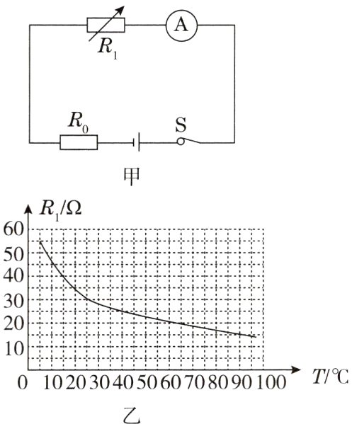 11. [2022.宜宾]根据热敏电阻的阻值随温度的升高而减小这一特性,小梅自制了一个电子温度计,其电路原理如图甲所示。已知电源电压恒为6V,$R_{0}$为定值电阻,$R_{1}$为热敏电阻,其阻值$R_{1}$随温度$T$变化的规律如图乙所示。当环境温度是40℃时,电流表示数为0.2A,此时$R_{1}$的电功率是________W;电流表的量程为0~0.3A,该温度计能测量的最高温度是________℃。