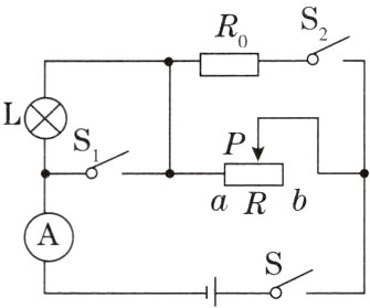 (2)闭合开关$S$、$S_{1}$、$S_{2}$,滑动变阻器R的滑片P仍在b端时,电流表的示数和滑动变阻器R的电功率。