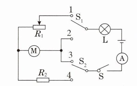 通过控制开关$S$、$S_{1}$和滑动变阻器$R$来改变灯L的亮度,实现“原地灯光秀”;通过改变直流电动机的转动方向及转速,实现“调速前进”或“定速后退”,如图所示。已知电源电压不变,标有“0.6A”的灯L的电阻不变且$R_{L}=10Ω$,定值电阻$R_{2}=5Ω$。当玩具车处于“原地灯光秀”模式时,电流表A的最大示数为0.4A。下列结论正确的是( )