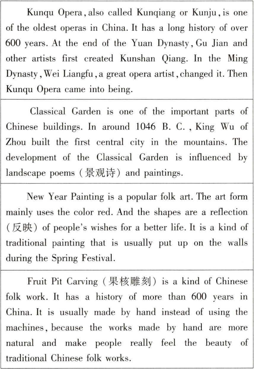 11. C [提示: 细节理解题。根据昆曲描述中的“IntheMing Dynasty,Wei Liangfu,a great opera artist,changed it.Then Kunqu Opera came into being.”可知,昆曲是在明代出现的,故选C。]