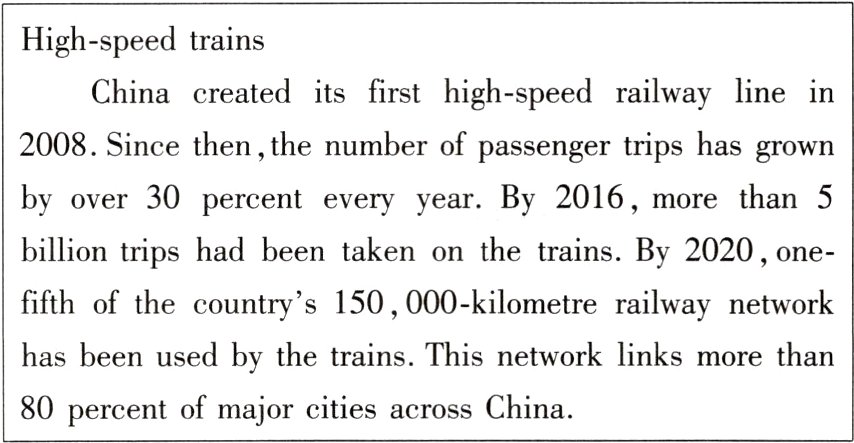 11.B[提示:细节理解题。根据高铁描述中的“Since then, the number of passenger trips has grown by over 30 percent every year.”可知,2008年以后数量增长了超过30%,故选B。]