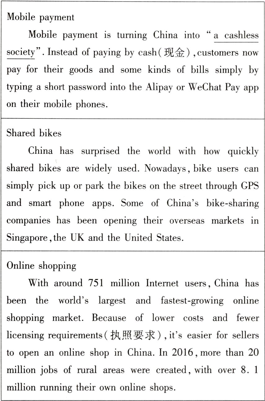 12.What does the underlined phrase“a cashless society”mean in Chinese?