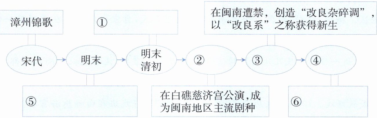 ④中华人民共和国成立后 ⑤传到台湾,与当地的民歌小调结合 ⑥定名为“芗剧”