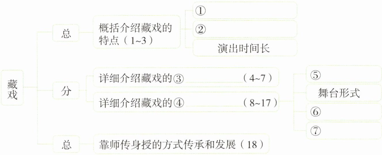 ①戴着面具演出 ②演出时没有舞台 ③来源 ④面具 ⑤主要特点 ⑥演出方式 ⑦演出形态