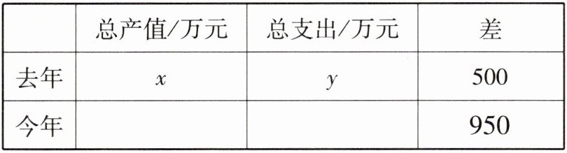 5. 某工厂去年的总产值比总支出多500万元。由于今年总产值比去年增加15%,总支出比去年节约了10%,因此,今年总产值比总支出多950万元。今年的总产值和总支出各是多少万元?