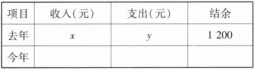 4. 小明家种植水果,去年收支相抵后,结余1 200元;今年因为改进了种植技术,他家水果获得丰收,收入比去年增加5%,支出比去年减少15%,今年比去年多结余1 140元。如果设小明家去年收入x元,支出为y元,那么: