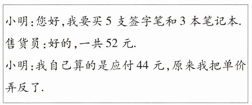 12. 周日,小明去文具店买文具,他与售货员的对话如下图,那么1支签字笔和1本笔记本应付______元.