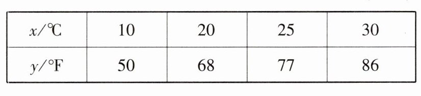 7. 如图是温度计的示意图,图中左边的温度表示摄氏温度,右边的温度表示华氏温度. 小明观察温度计发现,两个刻度x,y之间的关系如表. 据此可知,摄氏温度为15时,对应华氏温度应为 ( )