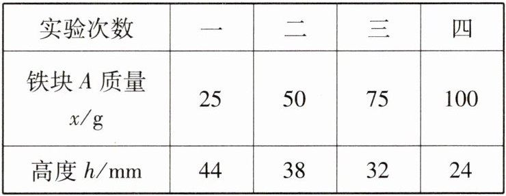 6. 跨学科·物理 物理课上,于老师让同学们做这样的实验:在放水的盆中放入质地均匀的木块B,再在其上方放置不同质量的铁块A. 已知木块B全程保持漂浮状态,通过测量木块B浮在水面上的高度h(mm)与铁块A的质量x(g),可得它们之间满足一次函数关系. 据此可以判断下表中记录错误的数据是 ( )