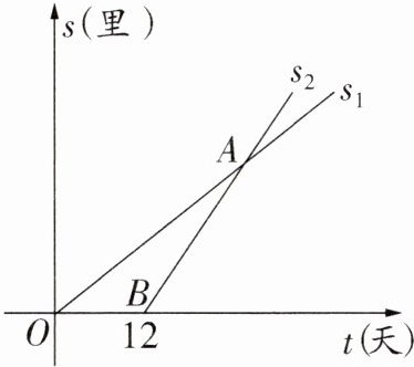 解析:$\frac{12\times150}{240 - 150}=20$(天),$20 + 12 = 32$(天),$20\times240 = 4800$(里),所以两图象交点A的坐标是$(32,4800)$.