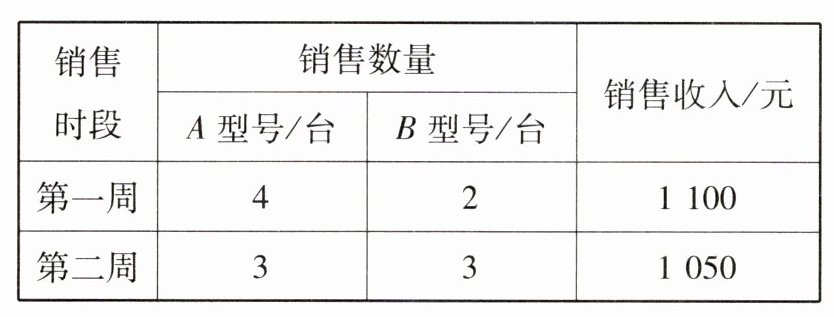 4. 近段时间气温逐渐升高,电风扇等电器销量持续走好,我区某电器超市销售每台进价分别为140元、100元的$A$,$B$两种型号的电风扇,近两周的销售情况如表: