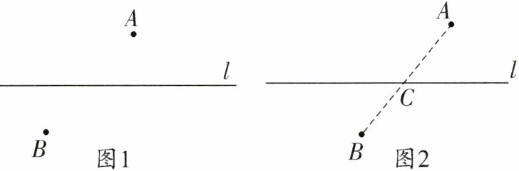 7. 如图1,$A$,$B$两个村庄在一条河$l$(不计河的宽度)的两侧,现要建一座码头,使它到$A$,$B$两个村庄的距离之和最小. 如图2,连接$AB$,与$l$交于点$C$,则$C$点即为所求码头的位置,这样做的理由是 ( )