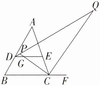 \therefore\angle DPC\) \(= 180^{\circ}-\angle PDE-\angle PGD = 115^{\circ}\) \(\therefore\angle CPQ = 180^{\circ}-\angle DPC = 65^{\circ}\)。又 \(\because\angle ACQ=\frac{1}{2}\angle ACF,