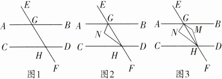 (3) 如图3,$M$,$N$分别为直线$AB$,$CD$之间不同的两点,连接$GM$,$HM$,$GN$,$HN$,且$GN$平分$\angle AGM$,$HN$平分$\angle CHM$,$\angle M-\angle N = 30^{\circ}$,求$\angle N$的度数.