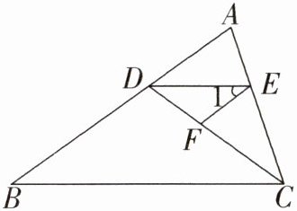12. 如图,点$D$,$E$分别在$\triangle ABC$的边$AB$,$AC$上,点$F$在线段$CD$上,且$\angle 1 = \angle B$,$DE// BC$.