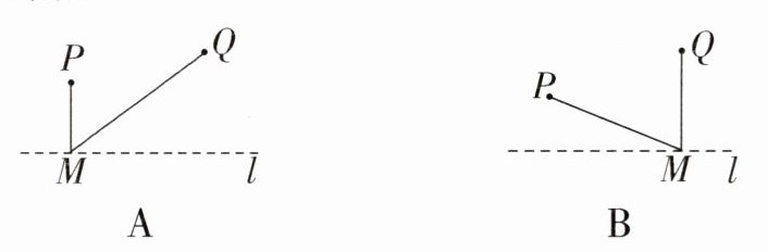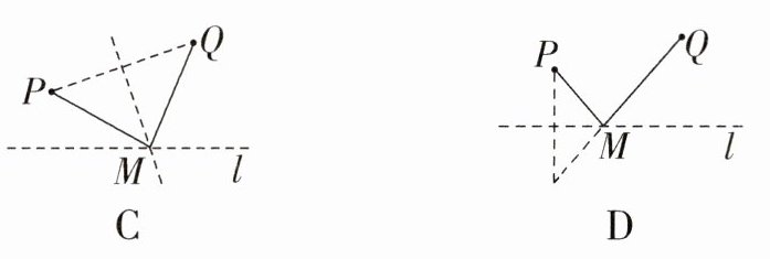 4. 直线l是一条河,P,Q是在l同侧的两个村庄. 欲在l上的M处修建一个水泵站,向P,Q两地供水,现有如下四种铺设方案,图中实线表示铺
