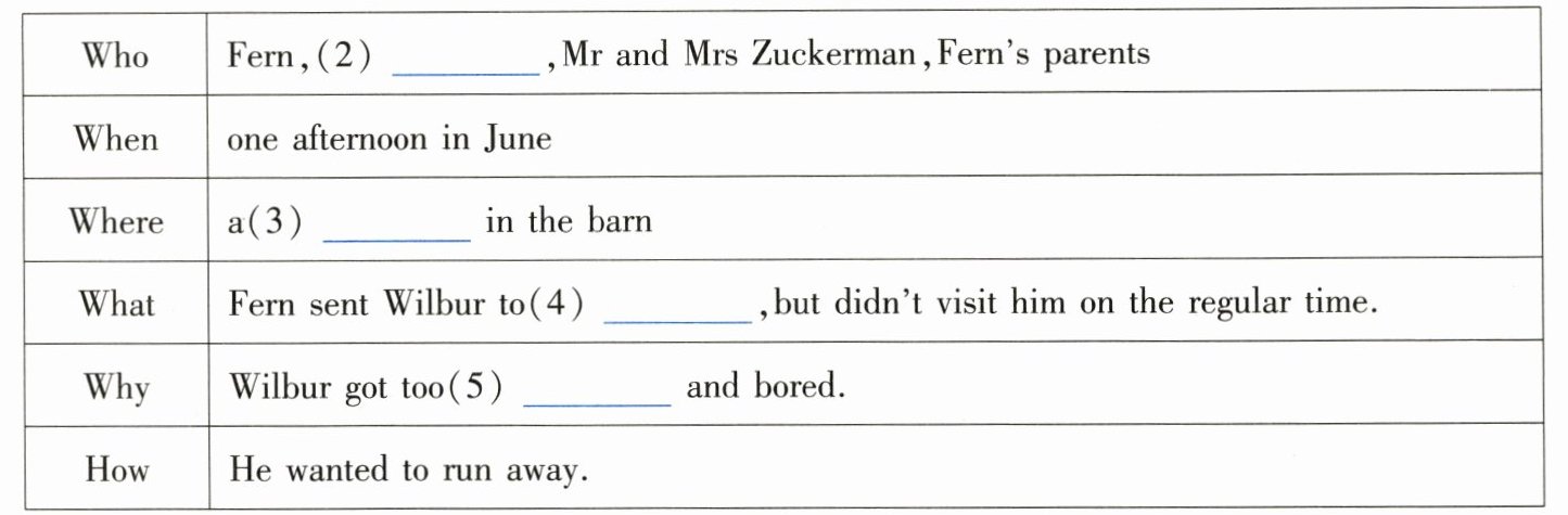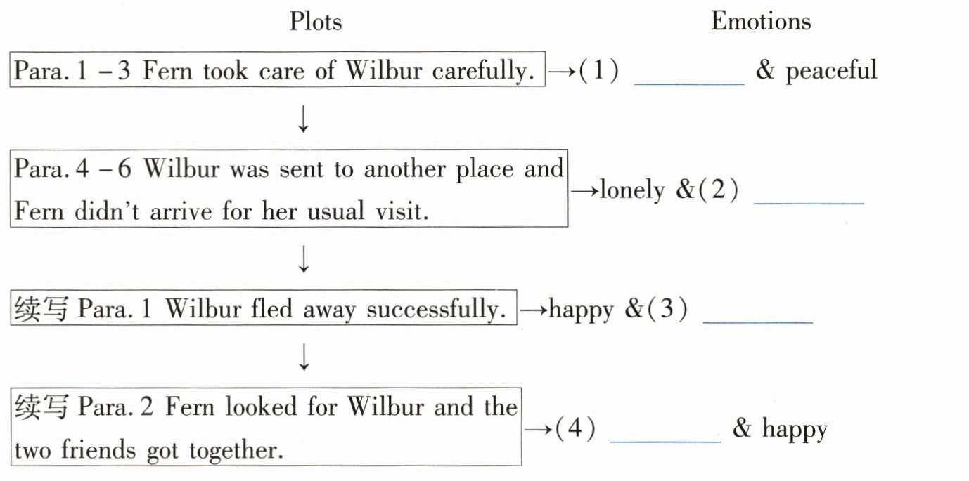 (4)worried [篇章训练]Paragraph1: “Why don't I flee from here and find Fern?” thought Wilbur and he started his plan immediately.Wandering back and forth, he was thinking what to do. It suddenly occurred to him that he could jump out of the pen because jumping was his strength. Walking to the fence, he tried his best to jump over it. To his surprise, he made it. So happy was he that he jumped up and down with excitement. Unfortunately, Mr and Mrs Zuckerman happened to come to the barn and found Wilbur was out of his pen. They immediately made every effort to catch him.Paragraph2: Mr and Mrs Zuckerman failed to drive Wilbur back to his pen but saw him rush into the bush. At a loss what to do, the couple told Fern the bad news. Fern hurried to her uncle's home, ran into the bush and looked for Wilbur, feeling worried and regretful. As night was beginning to fall, Fern still didn't find Wilbur. A ripple of disappointment welled up inside her. “Wilbur, where are you? I regret not coming earlier to see you, but this is because I prepared a surprise gift for you,” Fern said. Suddenly, some noise attracted her attention. Out rushed Wilbur from among the bushes. They hugged each other tightly. Finally the pair of friends got together again, tears streaming down their cheeks.