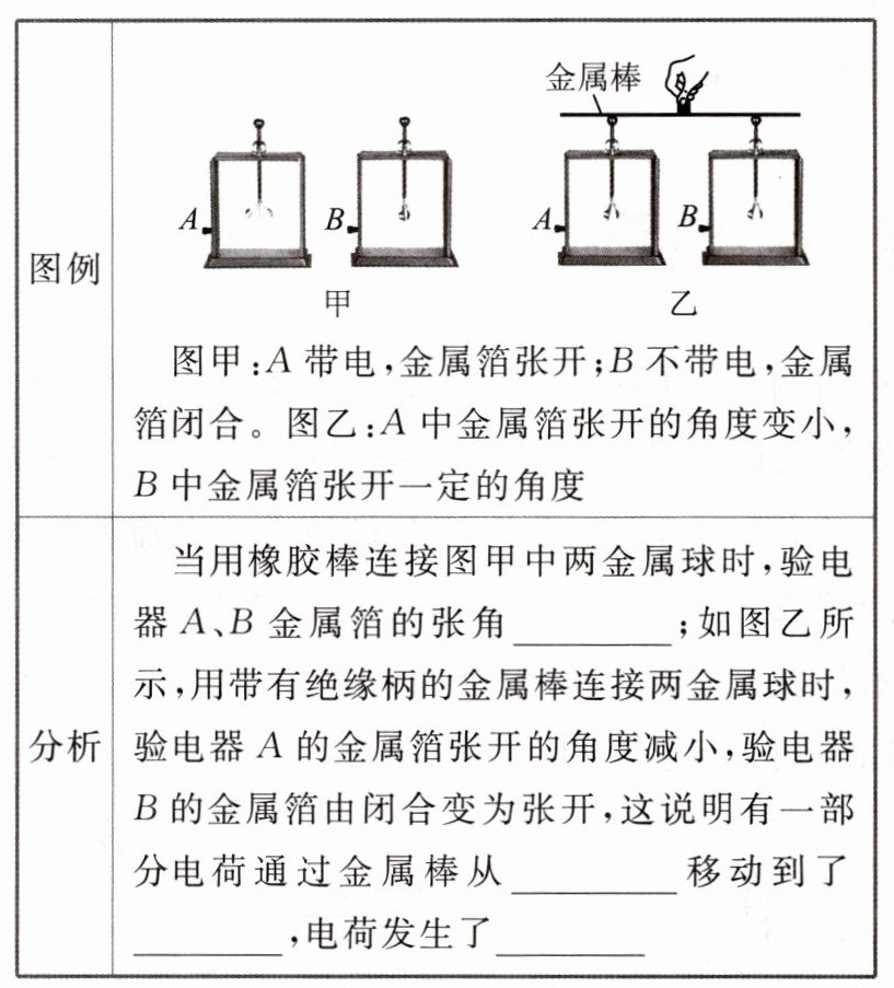 例2 各种原子都有相似的结构:原子的中心有__________,周围的电子绕其运动。用原子结构的知识可以解释摩擦起电现象:毛皮与橡胶棒摩擦后橡胶棒带负电,是因为橡胶棒__________(选填“得到”或“失去”)了电子。在生活中经常会遇到摩擦起电的现象,请举出一个实例:______________________________。