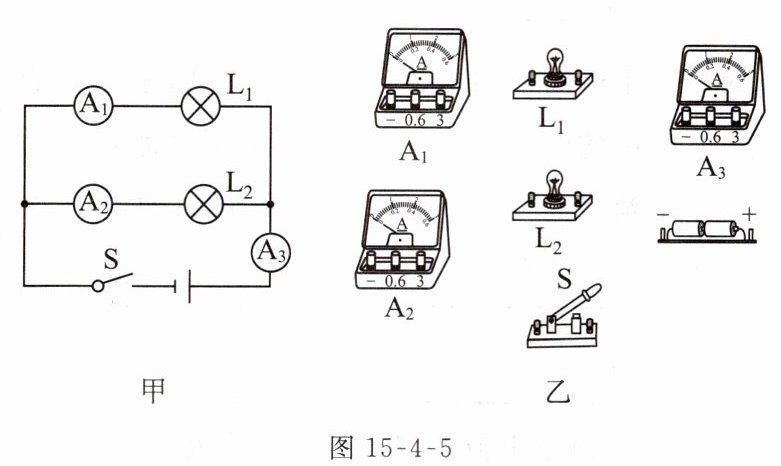 例5 按照图15 - 4 - 5甲所示的电路图,用笔画线代替导线,完成图乙的电路连接。