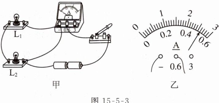 (1)小明想测量干路电流,连接的电路如图15 - 5 - 3甲所示,检查电路发现只有一根导线接错了,请在这根导线上打“×”,并用笔画线代替导线连接正确的电路。