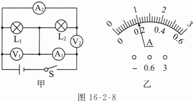 例3 (2023沈阳皇姑区校级期中)(多选)小明同学按如图16-2-8甲所示的电路进行实验,已知电源由四节新干电池串联组成。闭合开关S后,电流表A₁和A₂的指针均指在图乙所示的位置。下列说法正确的是 ( )