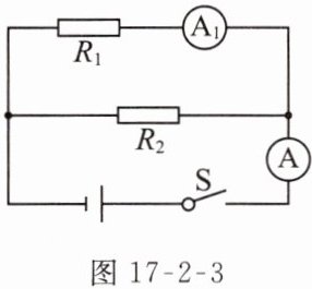 例4 如图17 - 2 - 3所示 的电路中,$R_1$的阻值是30 Ω,闭合开关S,电流表$A_1$的示数是0.2 A,电流表A的示数是0.5 A。求: